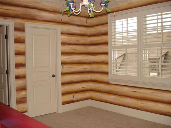 This mural covers all four walls. Look closely -- every wall is flat! The only real thing on the walls is the mantel and moose over the fireplace!